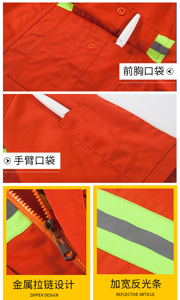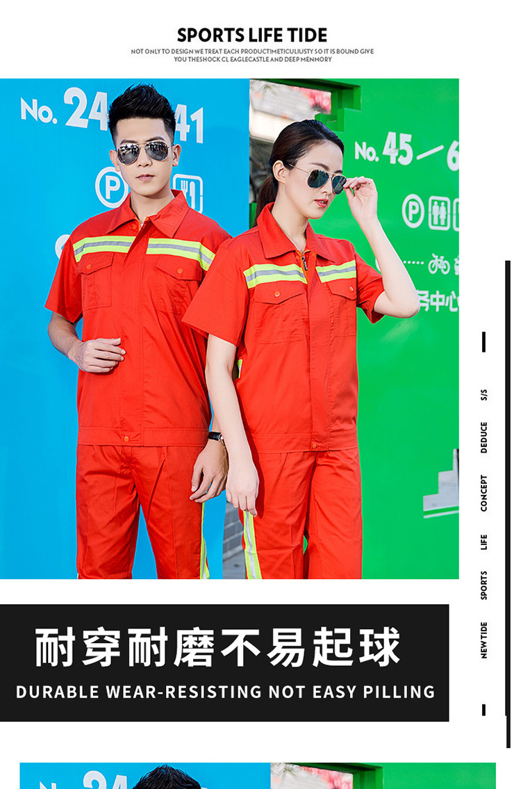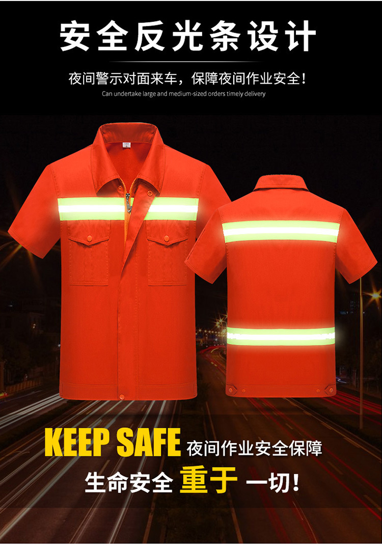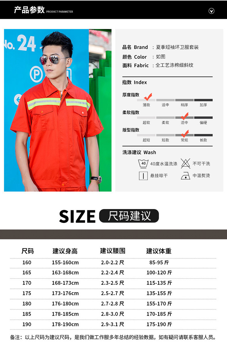 全工藝滌棉細(xì)斜紋春夏環(huán)衛(wèi)綠反光條短袖套裝工作服